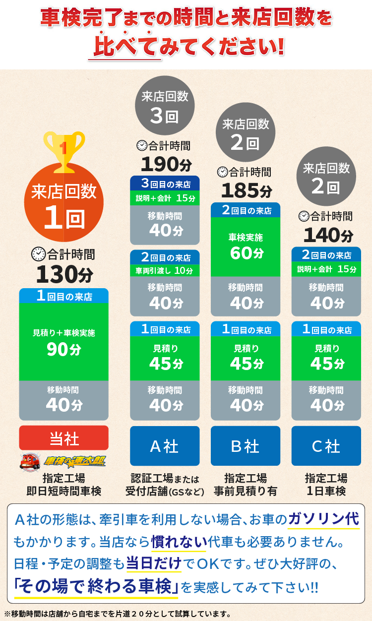 「車検の速太郎」金沢駅西店は、短時間車検を基本としておりますが、